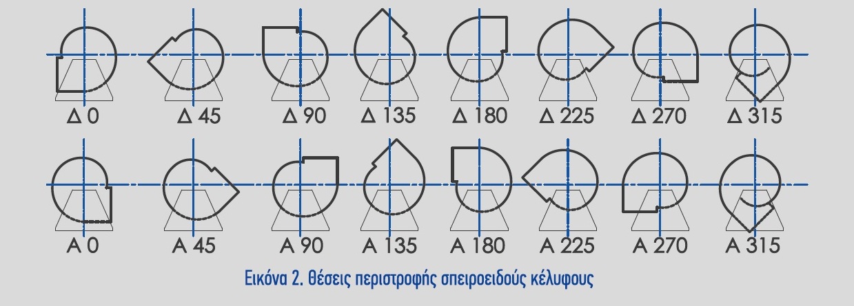 Στις συναρμογές F1, F2, F3, F5, F6 και F7 υπάρχει δυνατότητα περιστροφής του σπειροειδούς κελύφους του ανεμιστήρα σε οκτώ διαφορετικές γωνίες, όπως φαίνεται στην Εικόνα 2. Για τις συναρμογές F4 και F4D, F6D (διπλής αναρροφήσεως), το σπειροειδές κέλυφος μπορεί να περιστραφεί μόνο στις θέσεις Δ0, Δ90, Δ180, Δ270, Α0, Α90, Α180 και Α270.