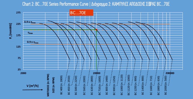 Σύμφωνα με την απαιτούμενη διαφορά ολικής πίεσης στη συγκεκριμένη εφαρμογή, η κατάλληλη σειρά ανεμιστήρων είναι η BC xxx-70Ε (Διάγραμμα 1). Με Δpt=200mmWG και 20.000 m³/h επιλέγεται απο την καμπύλη απόδοσης της σειράς BC .....70E (Διάγραμμα 2) το μέγεθος ανεμιστήρα BC 800-70E.